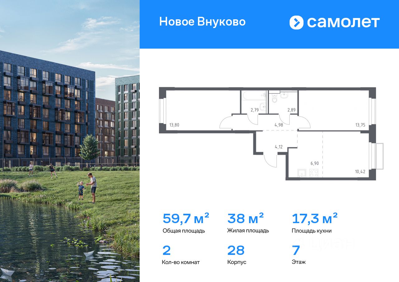 Строим кварталы для жизни с заботой о будущем. Предлагается 2-комнатная квартира комфорт-класса 59,65 кв.м в корпусе 28 на 7 этаже, в ЖК "Новое Внуково"