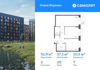 Строим кварталы для жизни с заботой о будущем. Предлагается 2-комнатная квартира комфорт-класса 51,9 кв.м в корпусе 28 на 7 этаже, в ЖК "Новое Внуково"