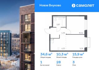 Строим кварталы для жизни с заботой о будущем. Предлагается 1-комнатная квартира комфорт-класса 34,63 кв.м в корпусе 28 на 3 этаже, в ЖК "Новое Внуково"