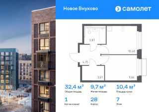 Строим кварталы для жизни с заботой о будущем. Предлагается 1-комнатная квартира комфорт-класса 32,35 кв.м в корпусе 28 на 7 этаже, в ЖК "Новое Внуково"