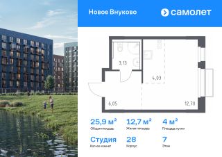 Строим кварталы для жизни с заботой о будущем. Предлагается квартира студия комфорт-класса 25,91 кв.м в корпусе 28 на 7 этаже, в ЖК "Новое Внуково"