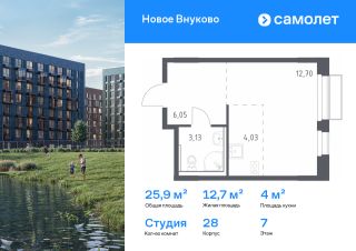 Строим кварталы для жизни с заботой о будущем. Предлагается квартира студия комфорт-класса 25,91 кв.м в корпусе 28 на 7 этаже, в ЖК "Новое Внуково"
