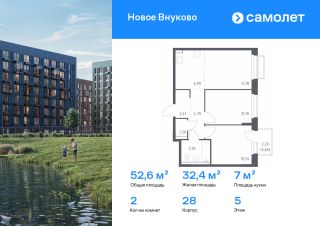 Строим кварталы для жизни с заботой о будущем. Предлагается 2-комнатная квартира комфорт-класса 52,6 кв.м в корпусе 28 на 5 этаже, в ЖК "Новое Внуково"