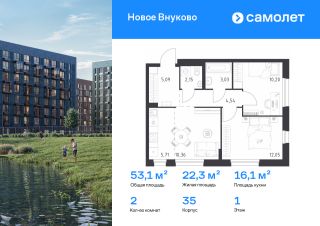 Строим кварталы для жизни с заботой о будущем. Предлагается 2-комнатная квартира комфорт-класса 53,13 кв.м в корпусе 35 на 1 этаже, в ЖК "Новое Внуково"