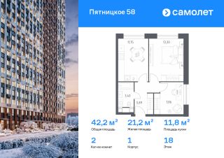 Строим кварталы для жизни с заботой о будущем. Предлагаются 2-комнатные апартаменты комфорт-класса 42,2 кв.м в корпусе 1 на 18 этаже, в ЖК "Пятницкое 58"