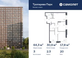 Строим кварталы для жизни с заботой о будущем. Предлагаются 3-комнатные апартаменты бизнес-класса 64,29 кв.м в корпусе 2.3 на 20 этаже, в МФК "Тропарево Парк"