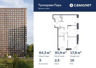 Строим кварталы для жизни с заботой о будущем. Предлагаются 3-комнатные апартаменты бизнес-класса 64,29 кв.м в корпусе 2.3 на 16 этаже, в МФК "Тропарево Парк"