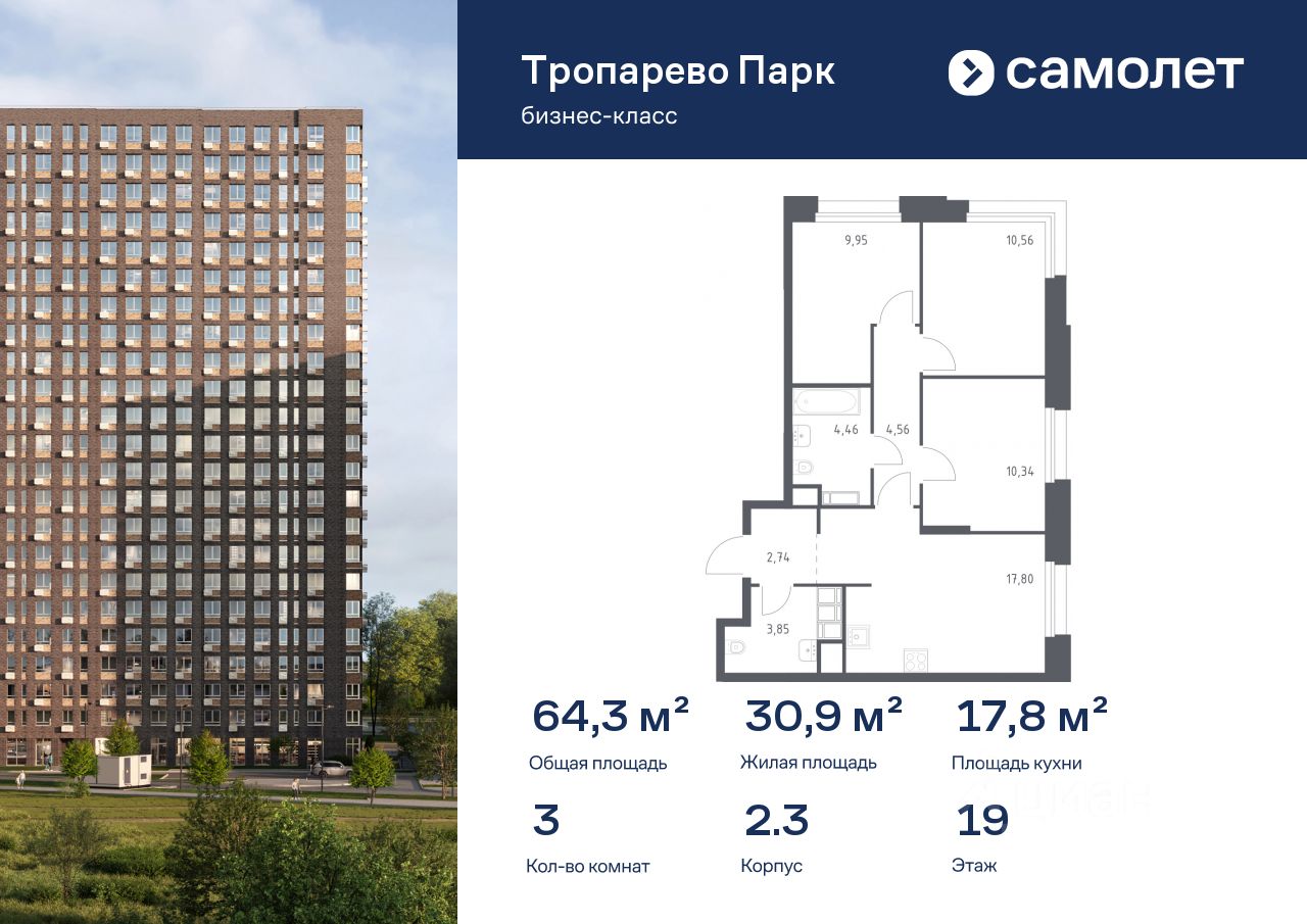 Строим кварталы для жизни с заботой о будущем. Предлагаются 3-комнатные апартаменты бизнес-класса 64,26 кв.м в корпусе 2.3 на 19 этаже, в МФК "Тропарево Парк"