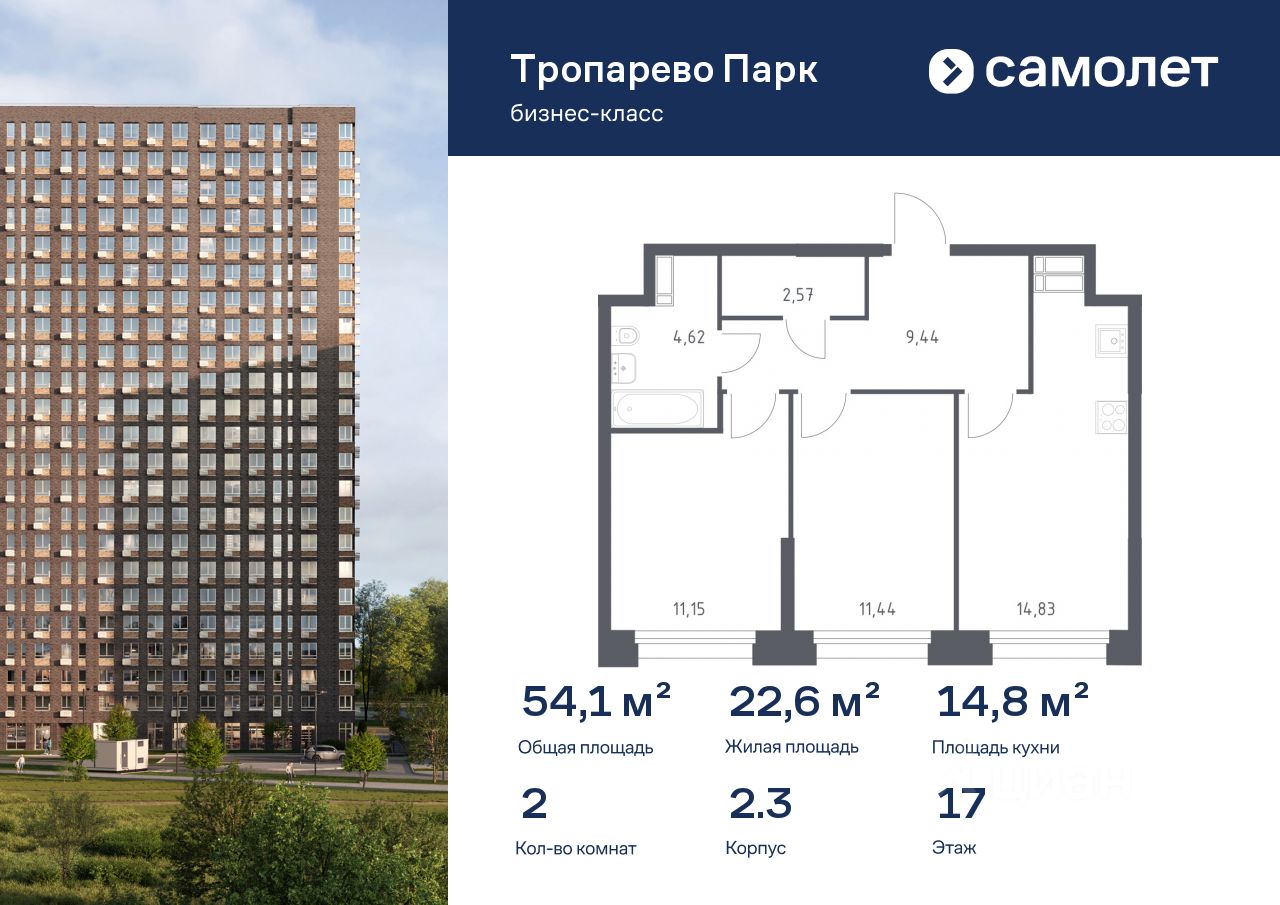 Строим кварталы для жизни с заботой о будущем. Предлагаются 2-комнатные апартаменты бизнес-класса 54,05 кв.м в корпусе 2.3 на 17 этаже, в МФК "Тропарево Парк"