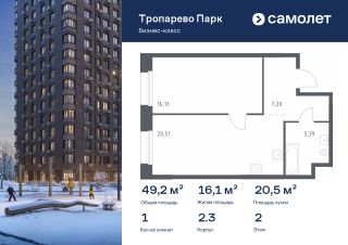 Строим кварталы для жизни с заботой о будущем. Предлагаются 1-комнатные апартаменты бизнес-класса 49,23 кв.м в корпусе 2.3 на 2 этаже, в МФК "Тропарево Парк"