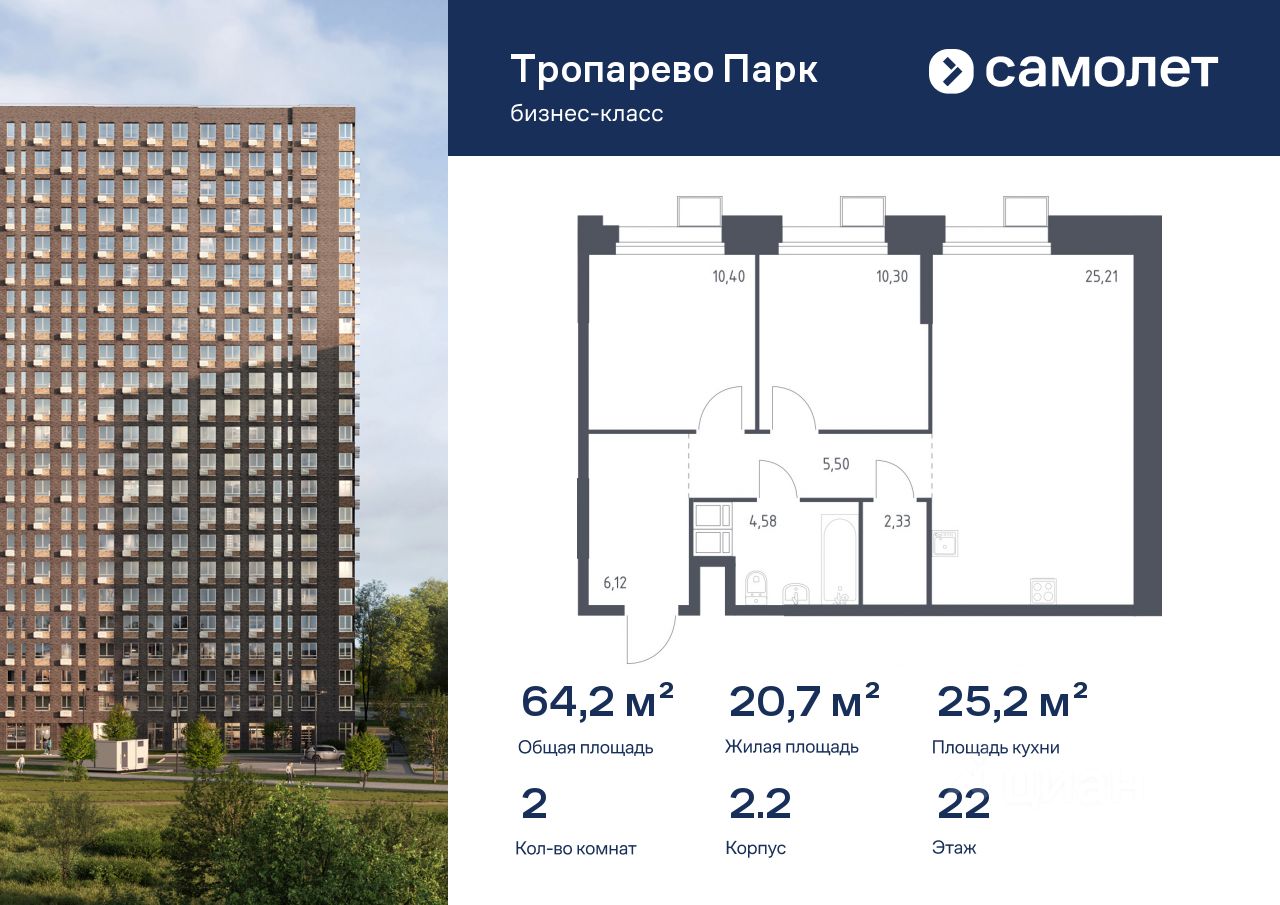 Строим кварталы для жизни с заботой о будущем. Предлагаются 2-комнатные апартаменты бизнес-класса 64,24 кв.м в корпусе 2.2 на 22 этаже, в МФК "Тропарево Парк"