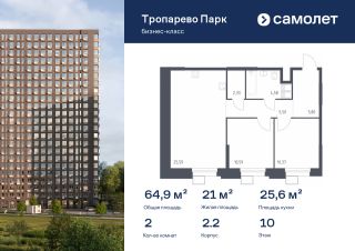 Строим кварталы для жизни с заботой о будущем. Предлагаются 2-комнатные апартаменты бизнес-класса 64,85 кв.м в корпусе 2.2 на 10 этаже, в МФК "Тропарево Парк"