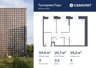 Строим кварталы для жизни с заботой о будущем. Предлагаются 2-комнатные апартаменты бизнес-класса 64,58 кв.м в корпусе 2.2 на 3 этаже, в МФК "Тропарево Парк"
