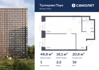 Строим кварталы для жизни с заботой о будущем. Предлагаются 1-комнатные апартаменты бизнес-класса 48,76 кв.м в корпусе 2.2 на 16 этаже, в МФК "Тропарево Парк"