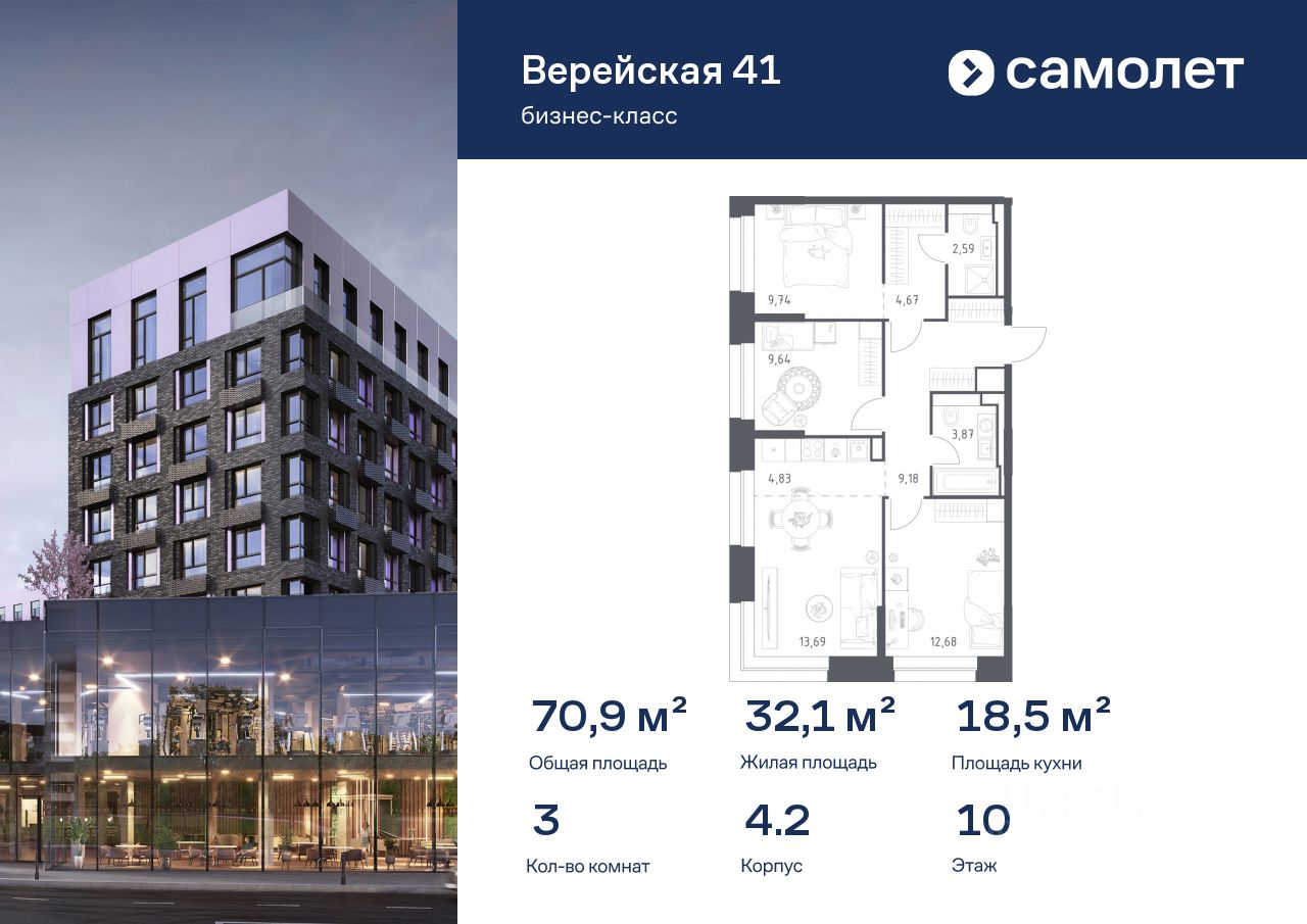 Строим кварталы для жизни с заботой о будущем. Предлагается 3-комнатная квартира бизнес-класса 70,89 кв.м в корпусе 4.2 на 10 этаже, в "Верейская 41"