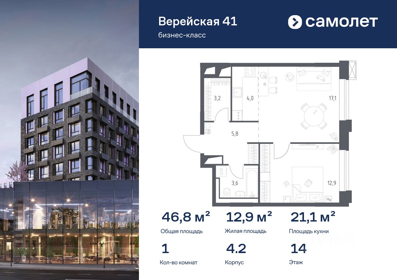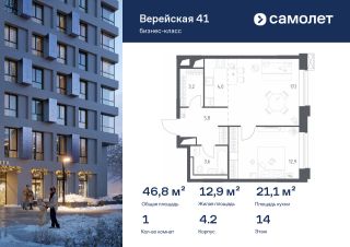 Строим кварталы для жизни с заботой о будущем. Предлагается 1-комнатная квартира бизнес-класса 46,8 кв.м в корпусе 4.2 на 14 этаже, в "Верейская 41"