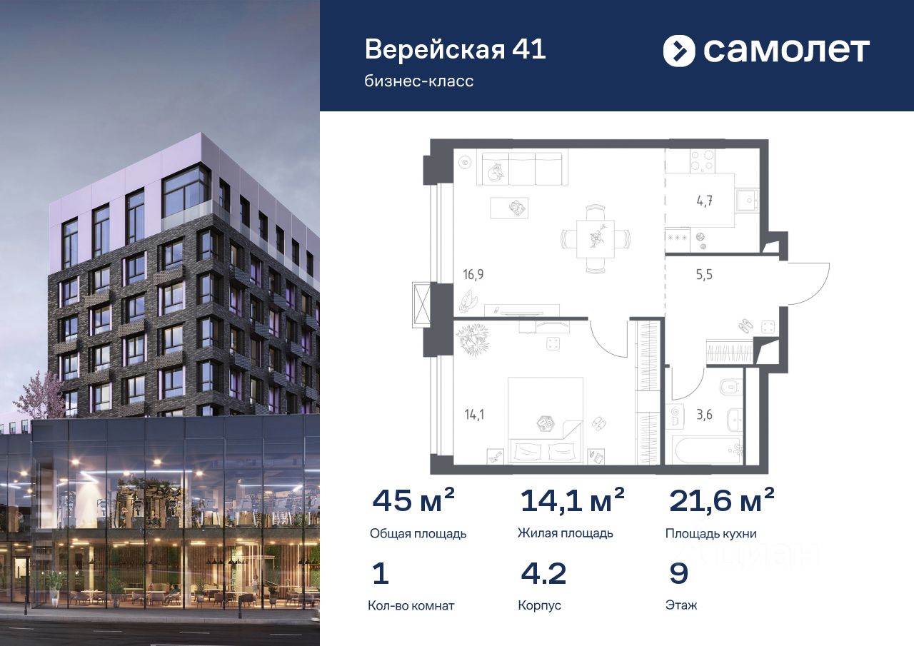 Строим кварталы для жизни с заботой о будущем. Предлагается 1-комнатная квартира бизнес-класса 44,98 кв.м в корпусе 4.2 на 9 этаже, в "Верейская 41"
