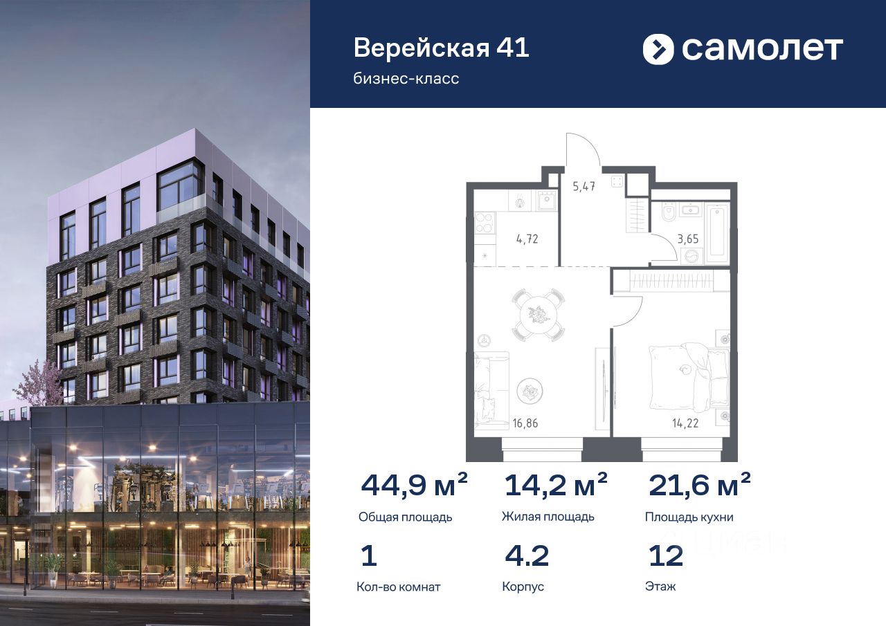 Строим кварталы для жизни с заботой о будущем. Предлагается 1-комнатная квартира бизнес-класса 44,92 кв.м в корпусе 4.2 на 12 этаже, в "Верейская 41"