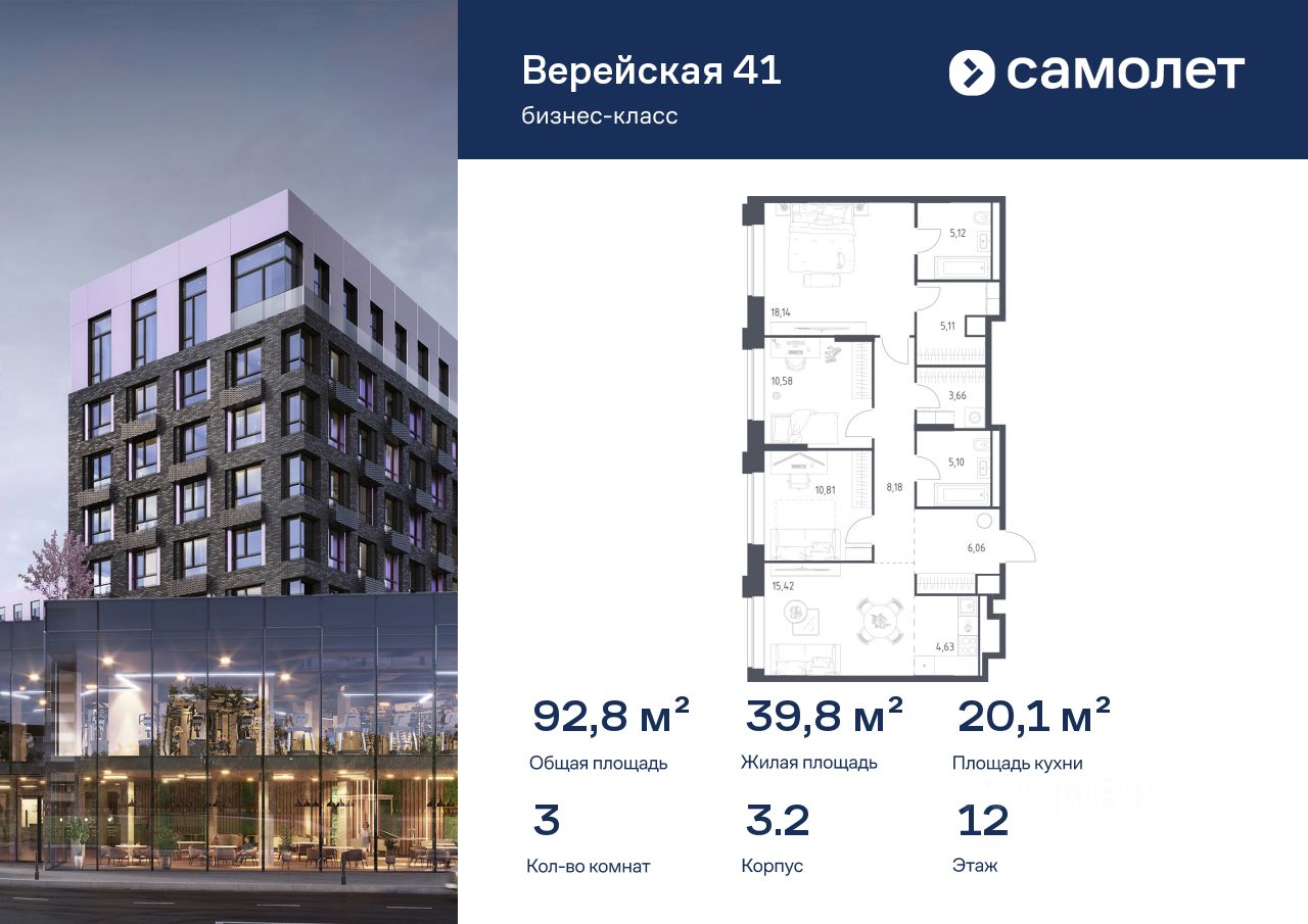 Строим кварталы для жизни с заботой о будущем. Предлагается 3-комнатная квартира бизнес-класса 92,81 кв.м в корпусе 3.2 на 12 этаже, в "Верейская 41"
