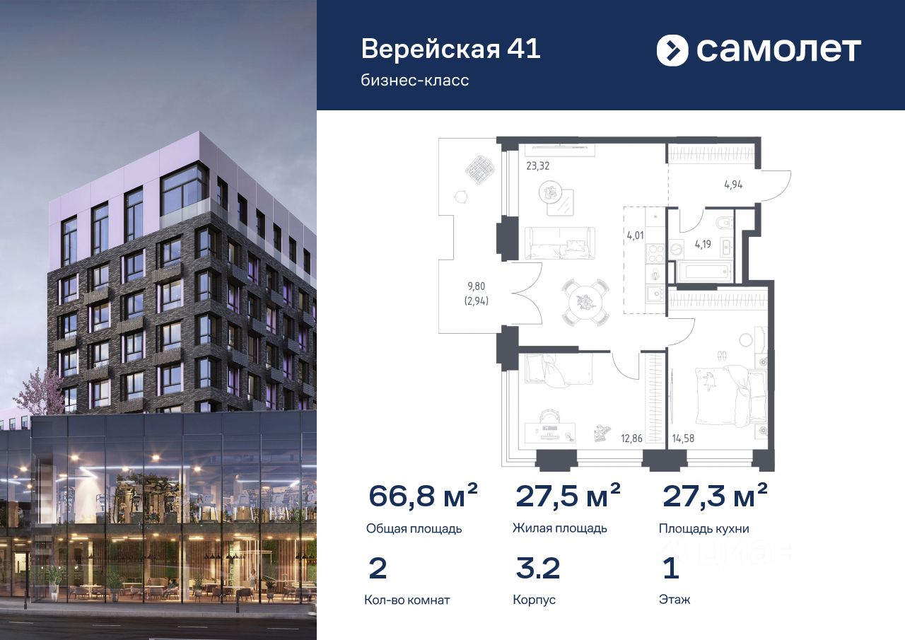 Строим кварталы для жизни с заботой о будущем. Предлагается 2-комнатная квартира бизнес-класса 66,84 кв.м в корпусе 3.2 на 1 этаже, в "Верейская 41"