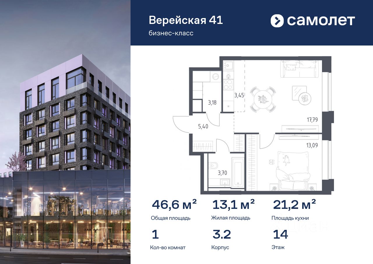 Строим кварталы для жизни с заботой о будущем. Предлагается 1-комнатная квартира бизнес-класса 46,61 кв.м в корпусе 3.2 на 14 этаже, в "Верейская 41"