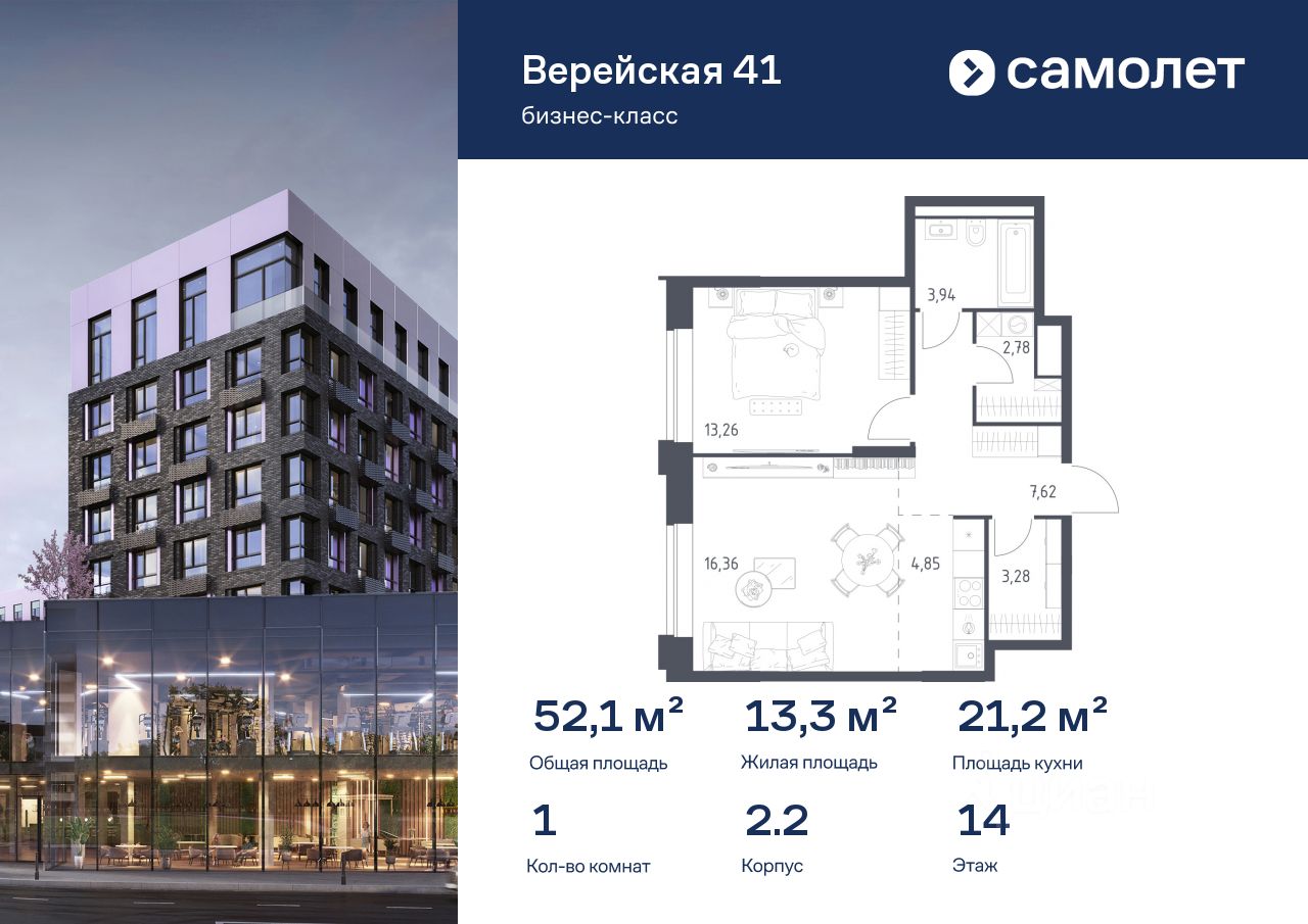 Строим кварталы для жизни с заботой о будущем. Предлагается 1-комнатная квартира бизнес-класса 52,09 кв.м в корпусе 2.2 на 14 этаже, в "Верейская 41"