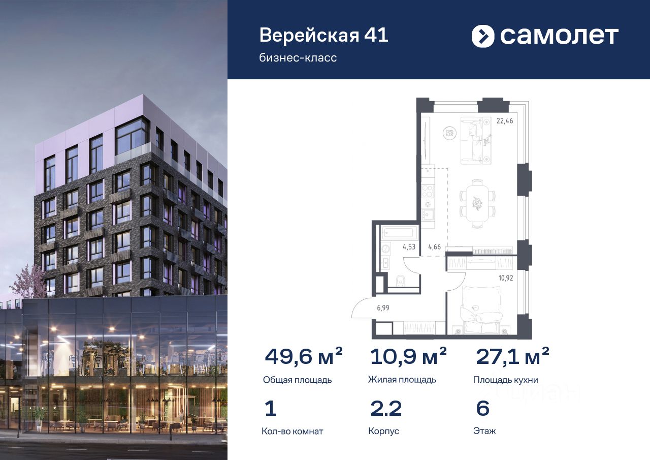 Строим кварталы для жизни с заботой о будущем. Предлагается 1-комнатная квартира бизнес-класса 49,56 кв.м в корпусе 2.2 на 6 этаже, в "Верейская 41"