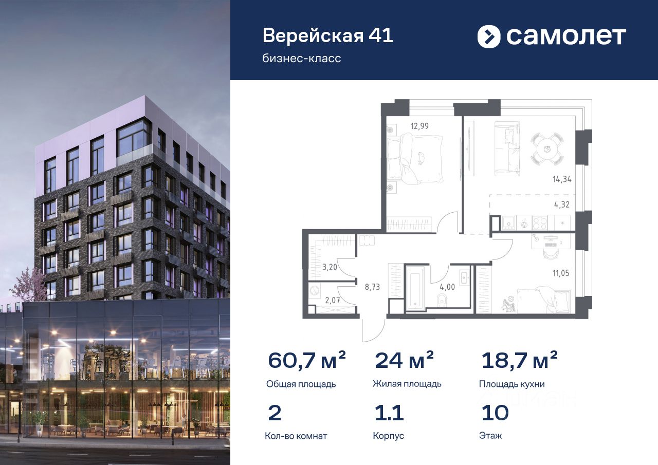 Строим кварталы для жизни с заботой о будущем. Предлагается 2-комнатная квартира бизнес-класса 60,7 кв.м в корпусе 1.1 на 10 этаже, в "Верейская 41"