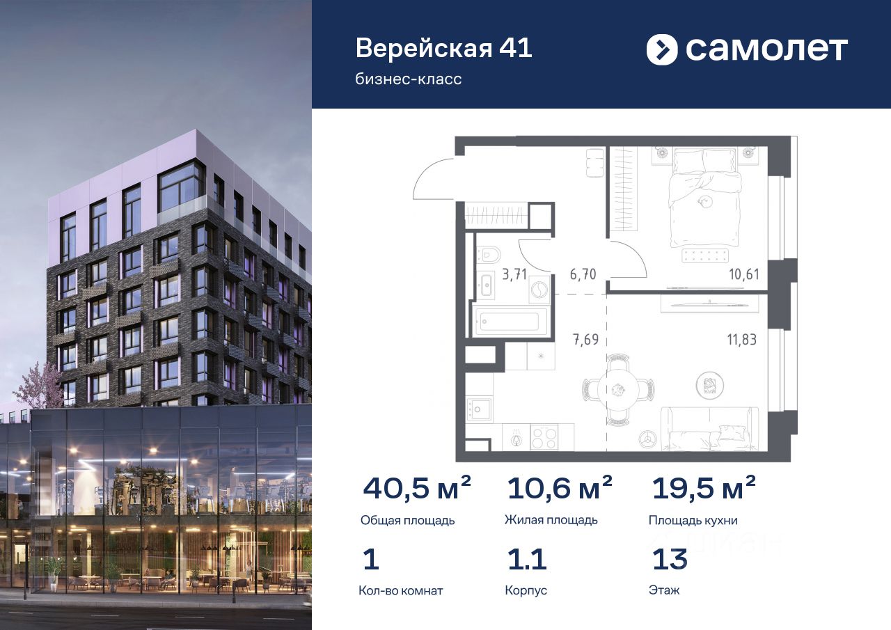 Строим кварталы для жизни с заботой о будущем. Предлагается 1-комнатная квартира бизнес-класса 40,54 кв.м в корпусе 1.1 на 13 этаже, в "Верейская 41"