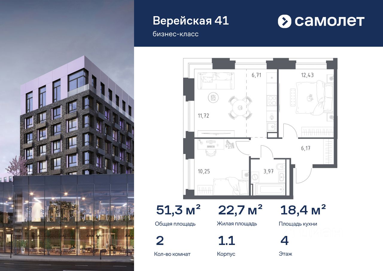 Строим кварталы для жизни с заботой о будущем. Предлагается 2-комнатная квартира бизнес-класса 51,25 кв.м в корпусе 1.1 на 4 этаже, в "Верейская 41"