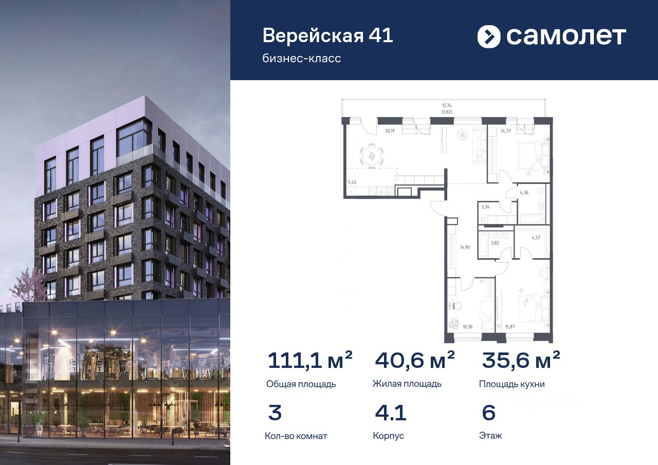 Строим кварталы для жизни с заботой о будущем. Предлагается 3-комнатная квартира бизнес-класса 111,07 кв.м в корпусе 4.1 на 6 этаже, в "Верейская 41"