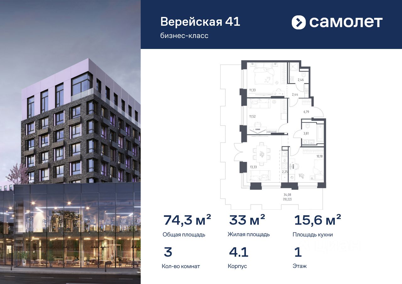 Строим кварталы для жизни с заботой о будущем. Предлагается 3-комнатная квартира бизнес-класса 74,33 кв.м в корпусе 4.1 на 1 этаже, в "Верейская 41"