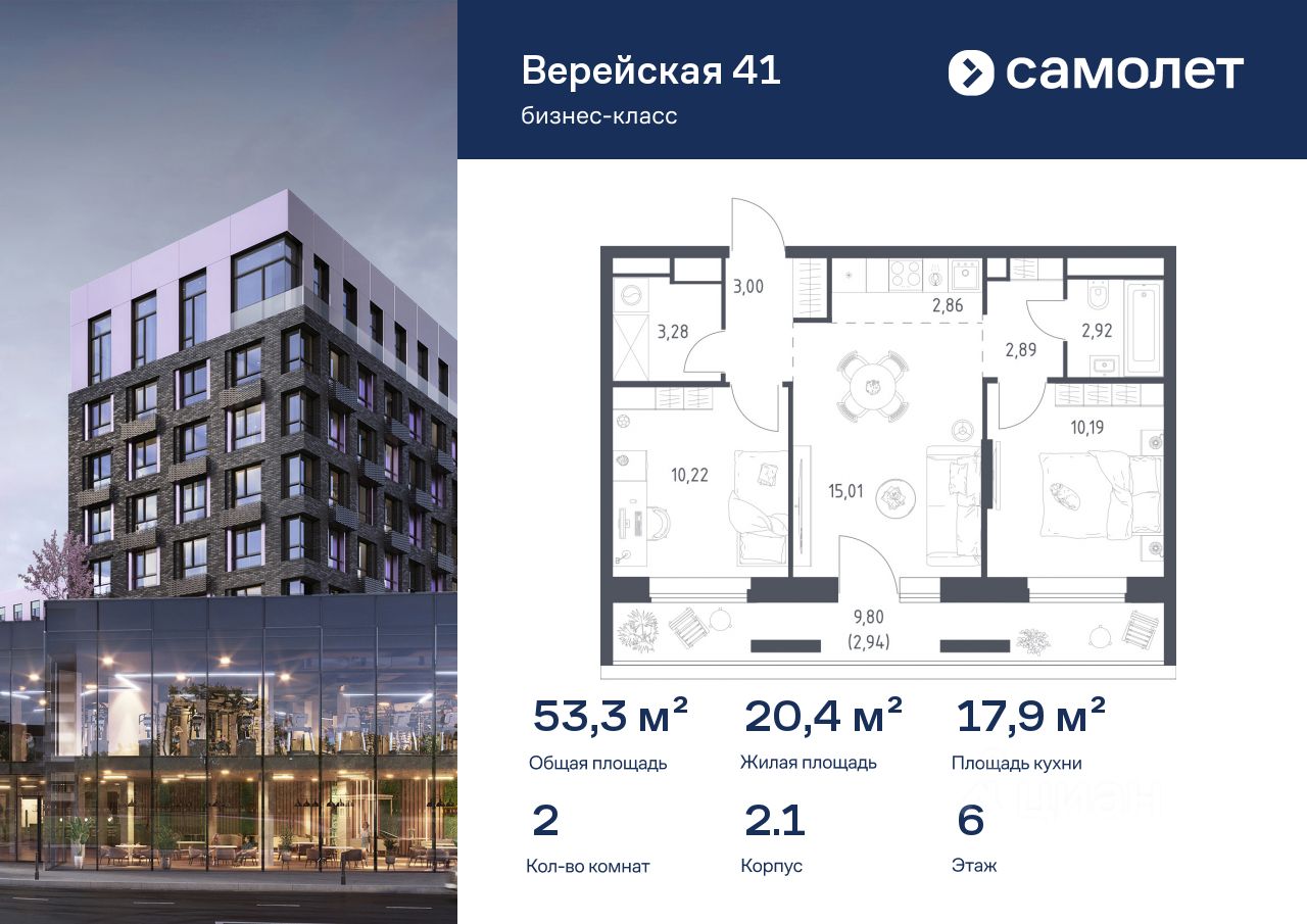 Строим кварталы для жизни с заботой о будущем. Предлагается 2-комнатная квартира бизнес-класса 53,31 кв.м в корпусе 2.1 на 6 этаже, в "Верейская 41"