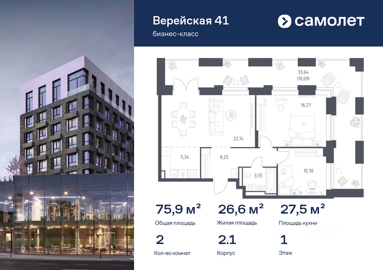 Строим кварталы для жизни с заботой о будущем. Предлагается 2-комнатная квартира бизнес-класса 75,94 кв.м в корпусе 2.1 на 1 этаже, в "Верейская 41"