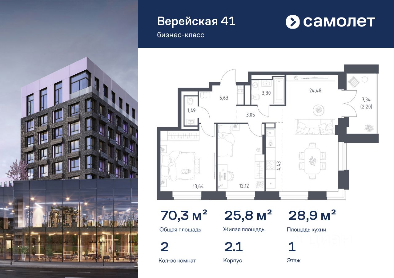 Строим кварталы для жизни с заботой о будущем. Предлагается 2-комнатная квартира бизнес-класса 70,34 кв.м в корпусе 2.1 на 1 этаже, в "Верейская 41"
