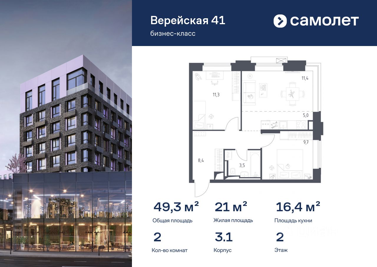 Строим кварталы для жизни с заботой о будущем. Предлагается 2-комнатная квартира бизнес-класса 49,28 кв.м в корпусе 3.1 на 2 этаже, в "Верейская 41"