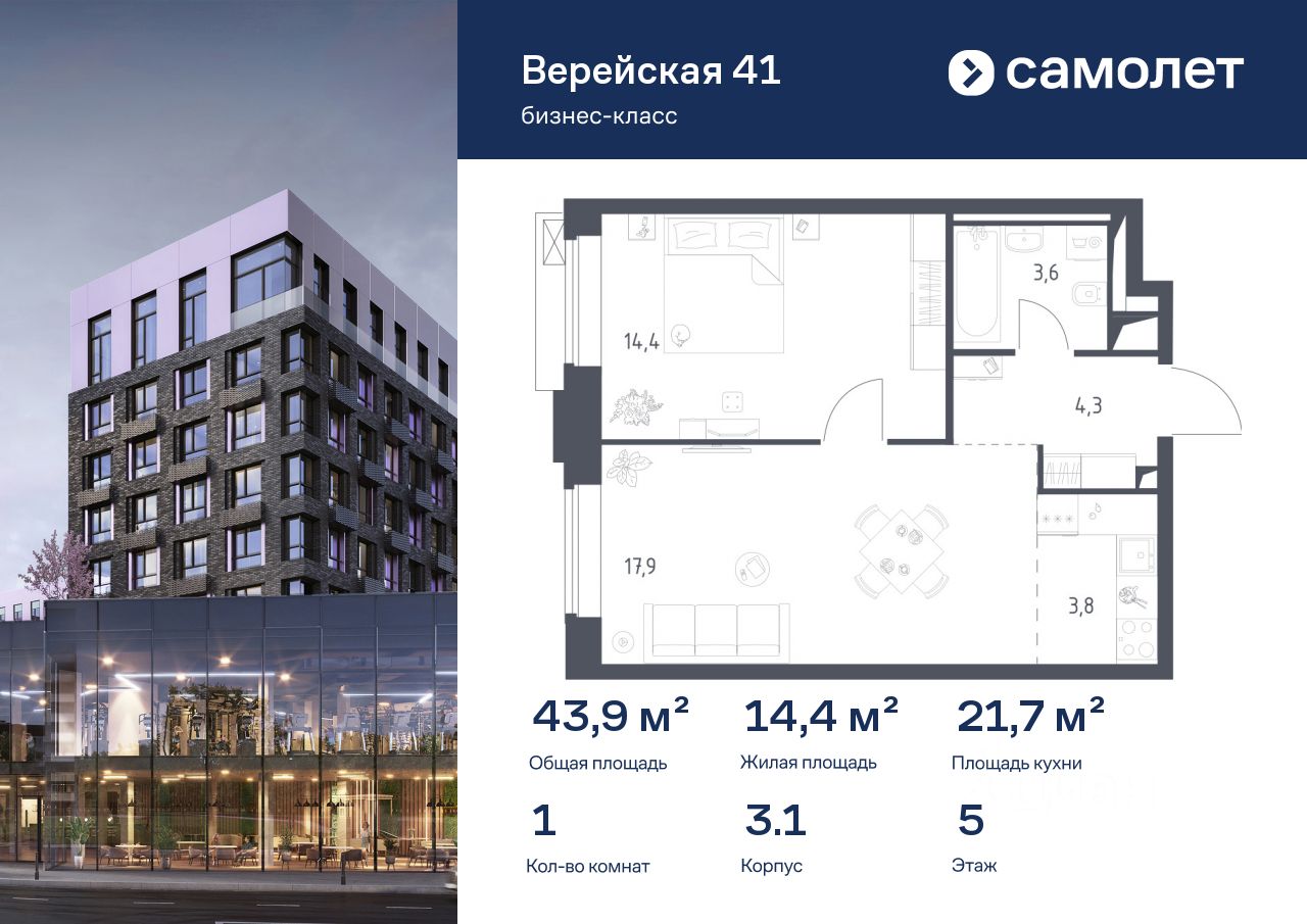 Строим кварталы для жизни с заботой о будущем. Предлагается 1-комнатная квартира бизнес-класса 43,91 кв.м в корпусе 3.1 на 5 этаже, в "Верейская 41"