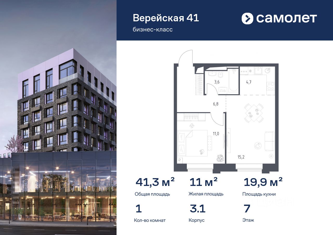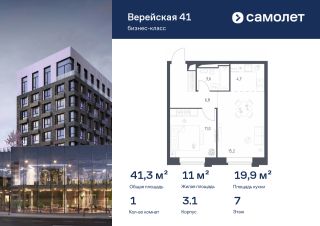 Строим кварталы для жизни с заботой о будущем. Предлагается 1-комнатная квартира бизнес-класса 41,28 кв.м в корпусе 3.1 на 7 этаже, в "Верейская 41"
