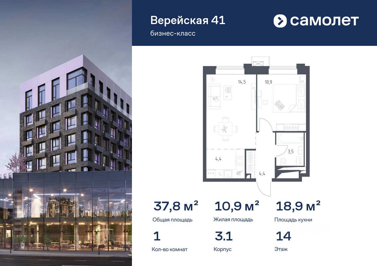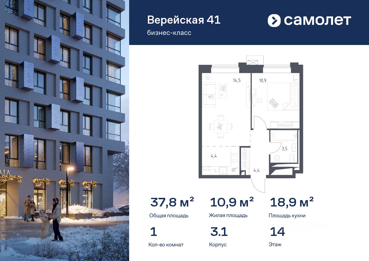 Строим кварталы для жизни с заботой о будущем. Предлагается 1-комнатная квартира бизнес-класса 37,75 кв.м в корпусе 3.1 на 14 этаже, в "Верейская 41"