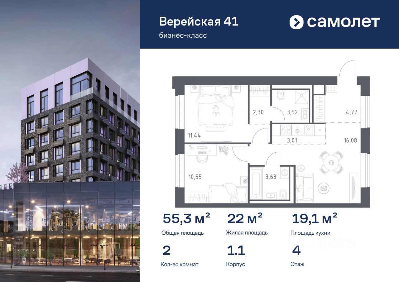 Строим кварталы для жизни с заботой о будущем. Предлагается 2-комнатная квартира бизнес-класса 55,3 кв.м в корпусе 1.1 на 4 этаже, в "Верейская 41"