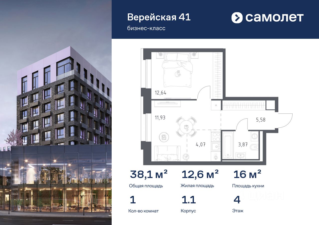 Строим кварталы для жизни с заботой о будущем. Предлагается 1-комнатная квартира бизнес-класса 38,09 кв.м в корпусе 1.1 на 4 этаже, в "Верейская 41"