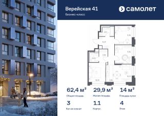 Строим кварталы для жизни с заботой о будущем. Предлагается 3-комнатная квартира бизнес-класса 62,43 кв.м в корпусе 1.1 на 4 этаже, в "Верейская 41"