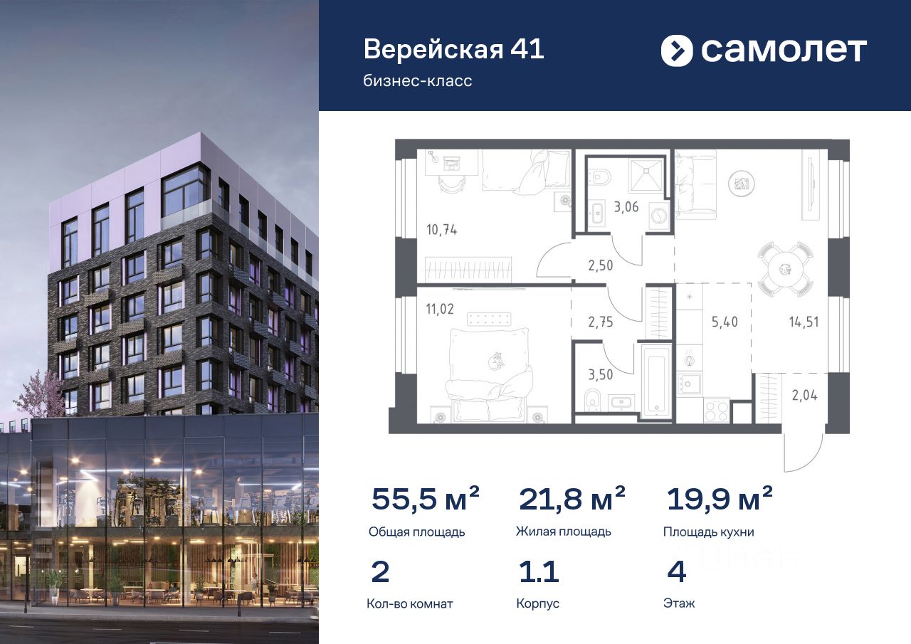 Строим кварталы для жизни с заботой о будущем. Предлагается 2-комнатная квартира бизнес-класса 55,52 кв.м в корпусе 1.1 на 4 этаже, в "Верейская 41"