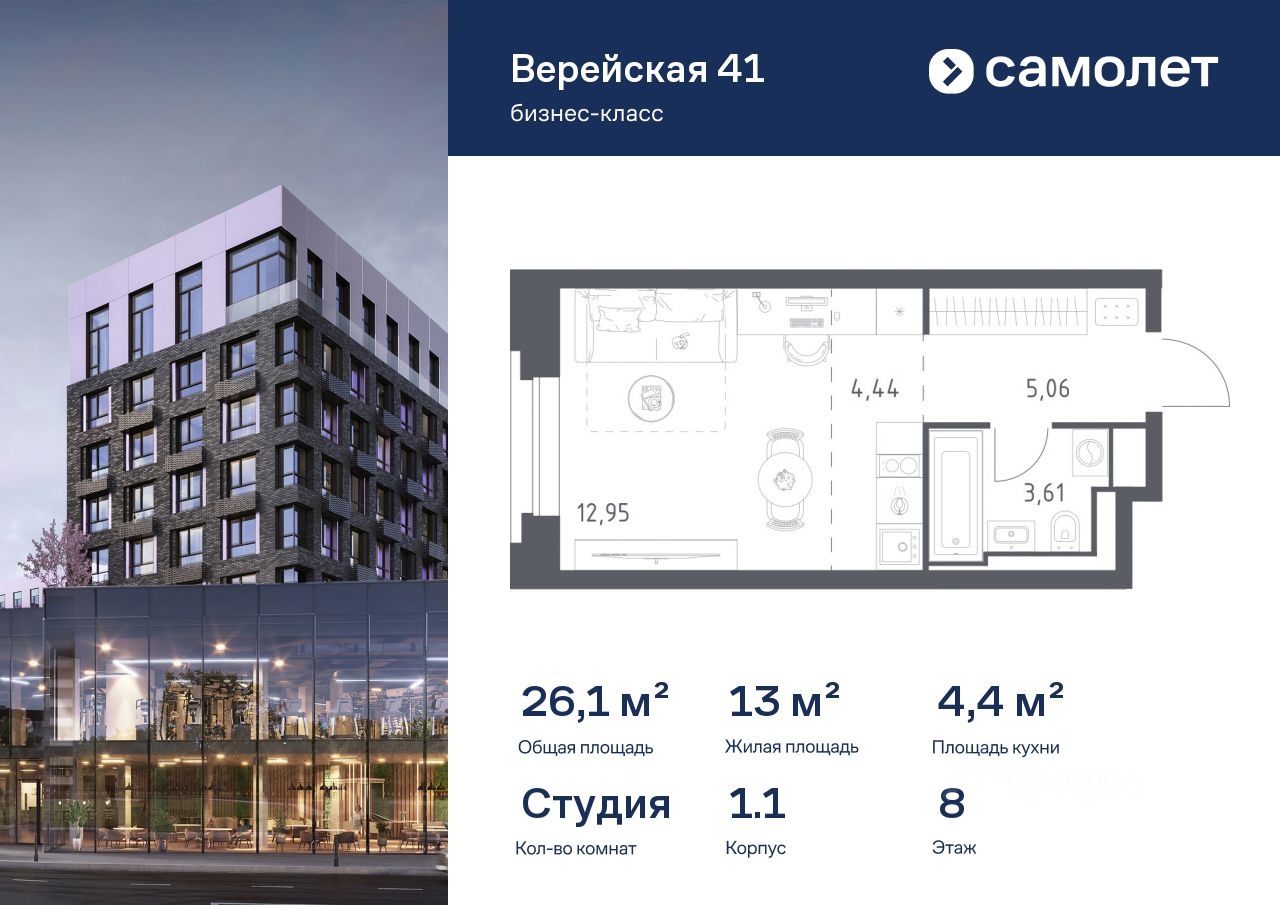 Строим кварталы для жизни с заботой о будущем. Предлагается квартира студия бизнес-класса 26,06 кв.м в корпусе 1.1 на 8 этаже, в "Верейская 41"