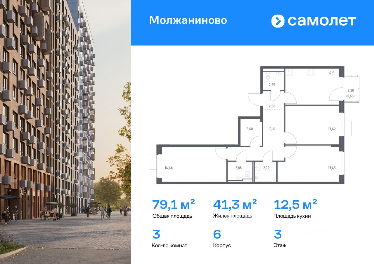 Строим кварталы для жизни с заботой о будущем. Предлагается 3-комнатная квартира комфорт-класса 79,12 кв.м в корпусе 6 на 3 этаже, в ЖК "Молжаниново"