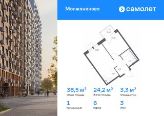 Строим кварталы для жизни с заботой о будущем. Предлагается 1-комнатная квартира комфорт-класса 36,51 кв.м в корпусе 6 на 3 этаже, в ЖК "Молжаниново"