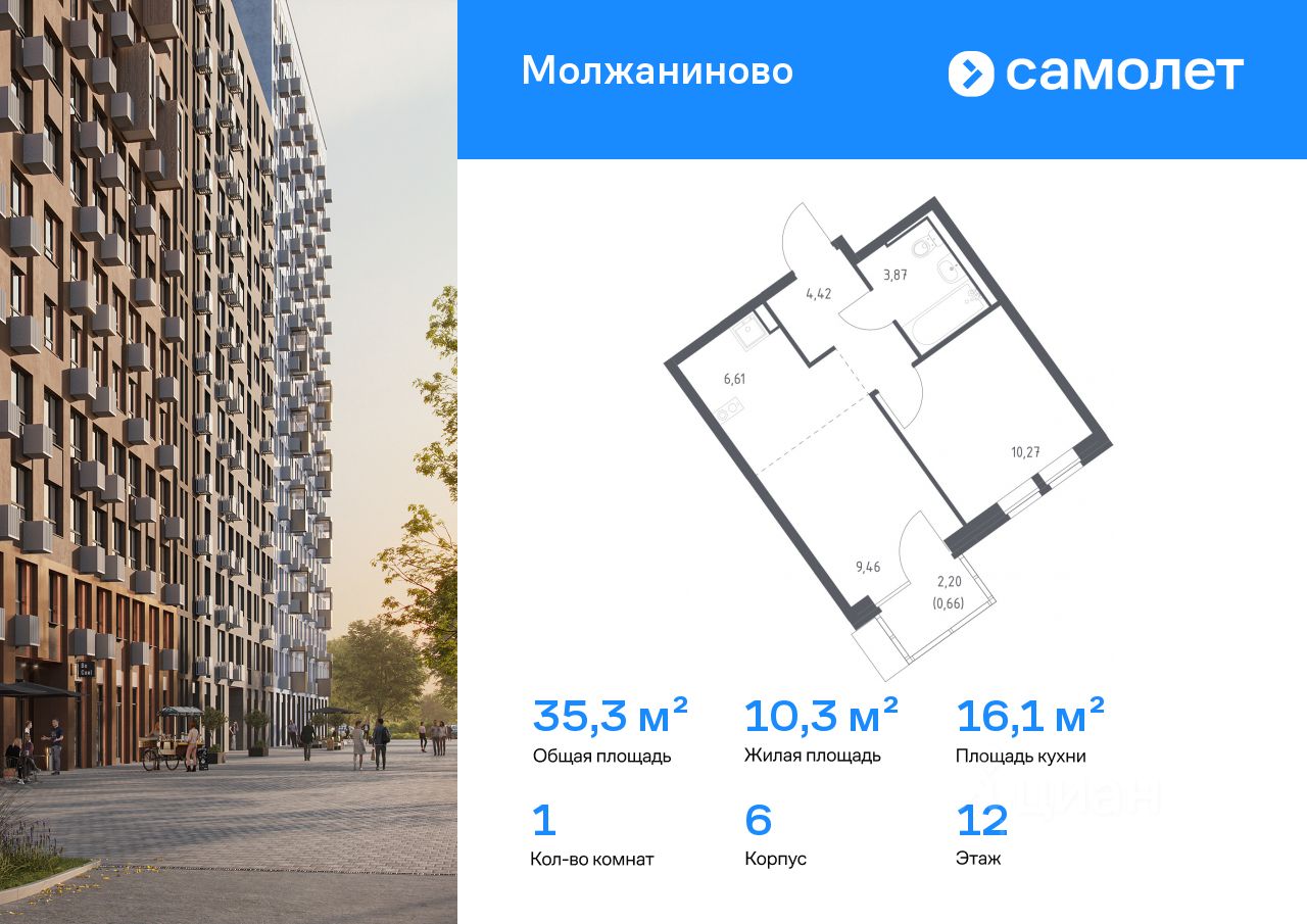 Строим кварталы для жизни с заботой о будущем. Предлагается 1-комнатная квартира комфорт-класса 35,29 кв.м в корпусе 6 на 12 этаже, в ЖК "Молжаниново"