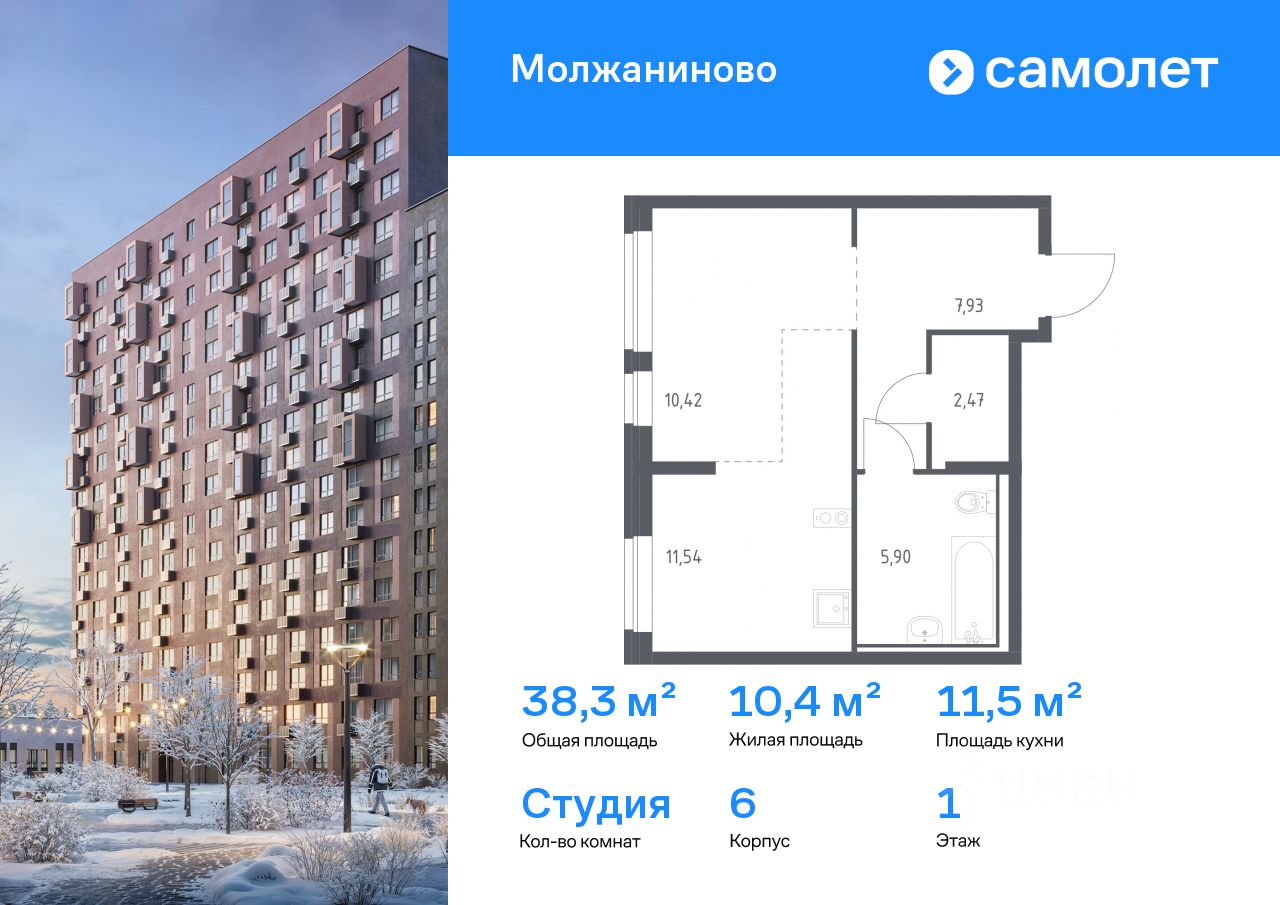 Строим кварталы для жизни с заботой о будущем. Предлагается квартира студия комфорт-класса 38,26 кв.м в корпусе 6 на 1 этаже, в ЖК "Молжаниново"