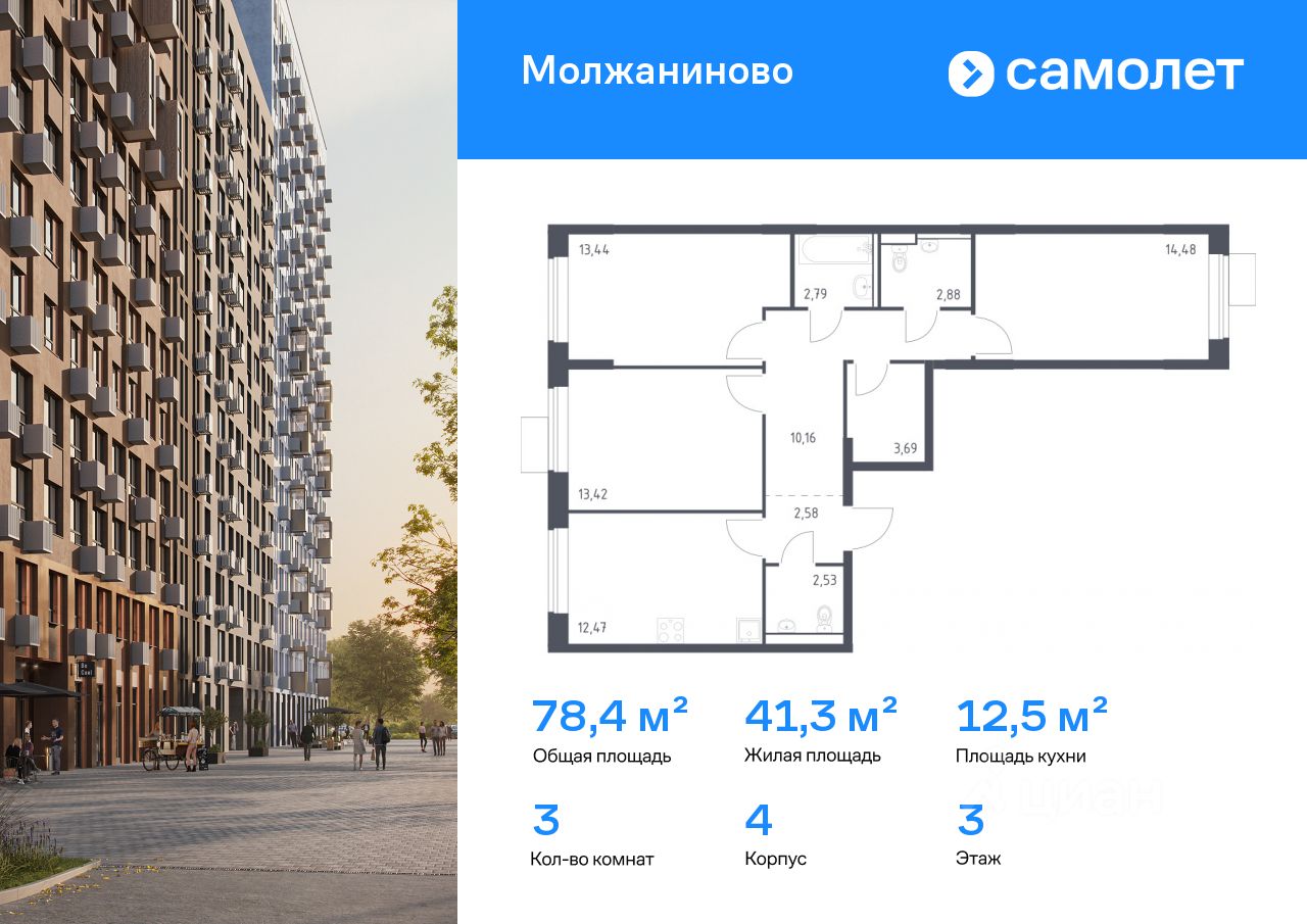 Строим кварталы для жизни с заботой о будущем. Предлагается 3-комнатная квартира комфорт-класса 78,44 кв.м в корпусе 4 на 3 этаже, в ЖК "Молжаниново"