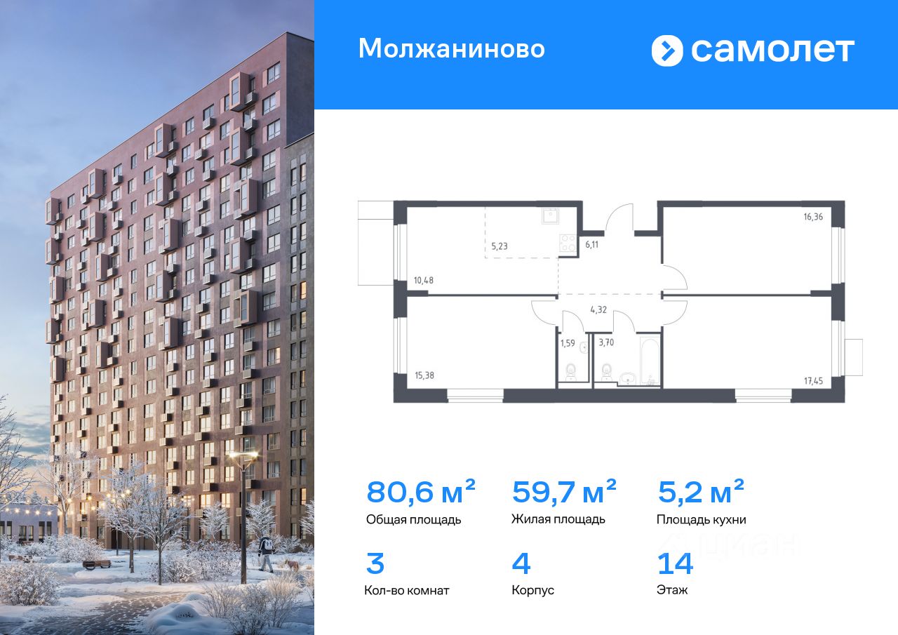 Строим кварталы для жизни с заботой о будущем. Предлагается 3-комнатная квартира комфорт-класса 80,62 кв.м в корпусе 4 на 14 этаже, в ЖК "Молжаниново"
